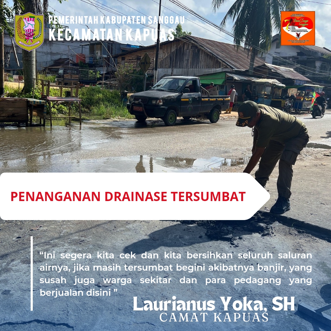Tim kecamatan kapuas bertugas mengecek lubang-lubang selokan yang tersumbat di titik mana-mana saja, semantara itu camat Kapuas terlihat selain membantu petugas yang bekerja membersihkan selokan, camat Kapuas juga membantu dengan cara memberi arahan agar para pekerja lebih terarah dalam membersihkan selokan.